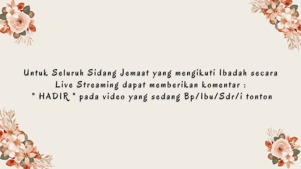Bagi seluruh Sidang Jemaat dapat mengikuti Layanan Ibadah Minggu Online melalui Akun Channel Youtube dan Facebook GBI Palembang secara LIVE STEREAMING, dapat memberikan komentar : “HADIR” pada video yang sedang Bp/Ibu/Sdr/i tonton.