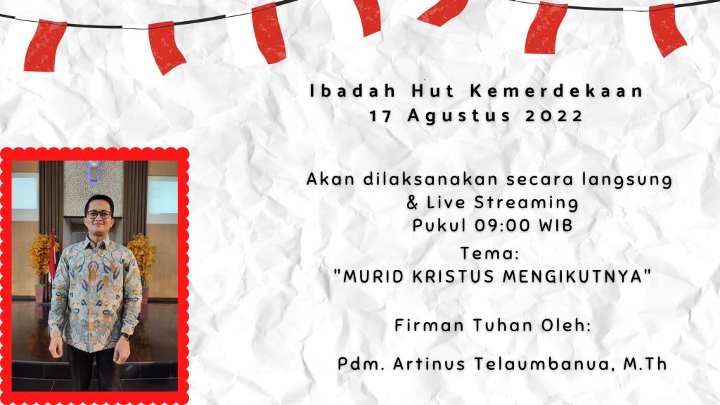 Ibadah HUT Kemerdekaan Rabu, 17 Agustus 2022 dimulai Pukul 09.00 WIB. Firman Tuhan akan dilayani oleh : Pdm. Artinus Telaumbanua, M.Th