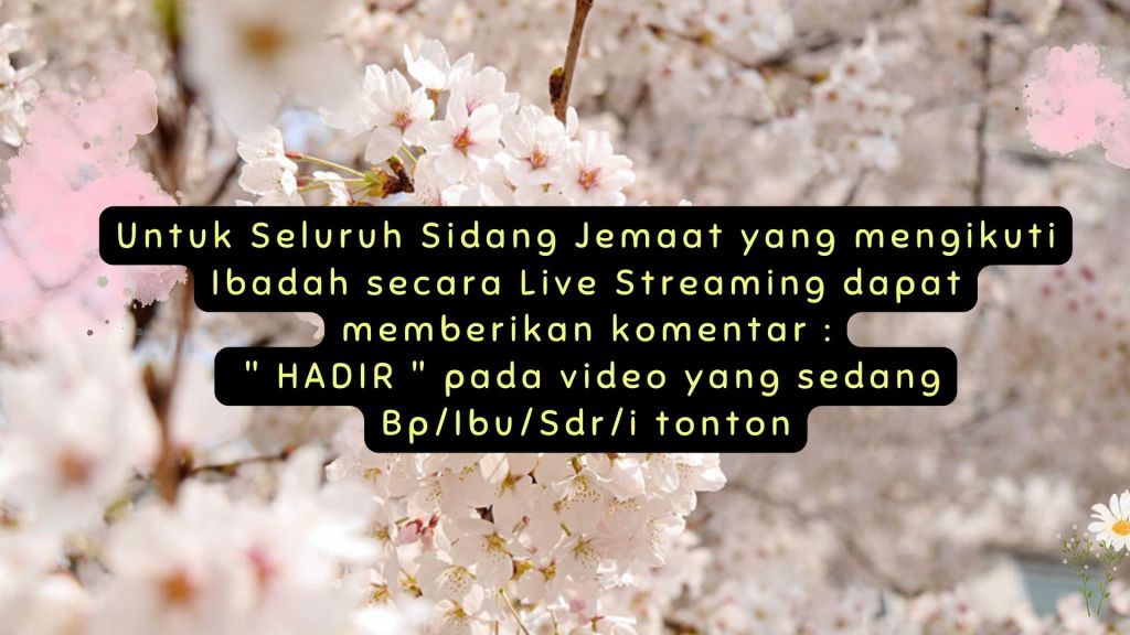 Bagi seluruh Sidang Jemaat dapat mengikuti Layanan Ibadah Minggu Online melalui Akun Channel Youtube dan Facebook GBI Palembang secara LIVE STEREAMING, dapat memberikan komentar : “HADIR” pada video yang sedang Bp/Ibu/Sdr/i tonton.