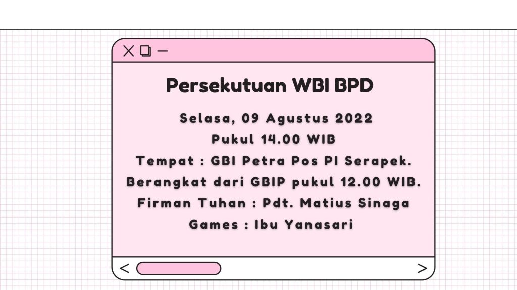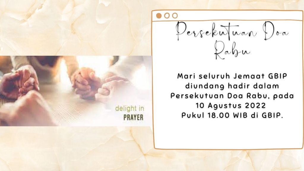 Mari seluruh Jemaat GBIP diundang hadir dalam Persekutuan Doa Rabu, pada 10 Agustus 2022 Pukul 18.00 WIB di GBIP.