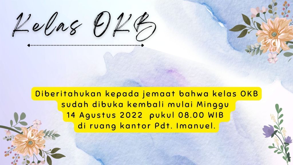 Diberitahukan kepada jemaat bahwa Kelas OKB, sudah dibuka kembali mulai Minggu, 14 Agustus 2022 pukul 08.00 WIB di ruang kantor Pdt. Imanuel Rajiono, S.Th.,M.A.