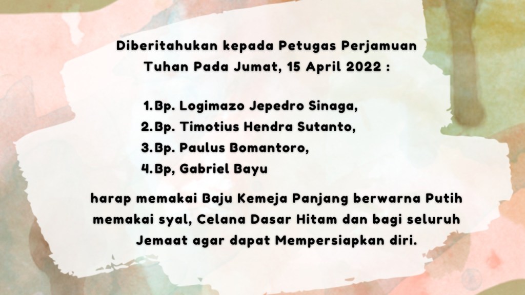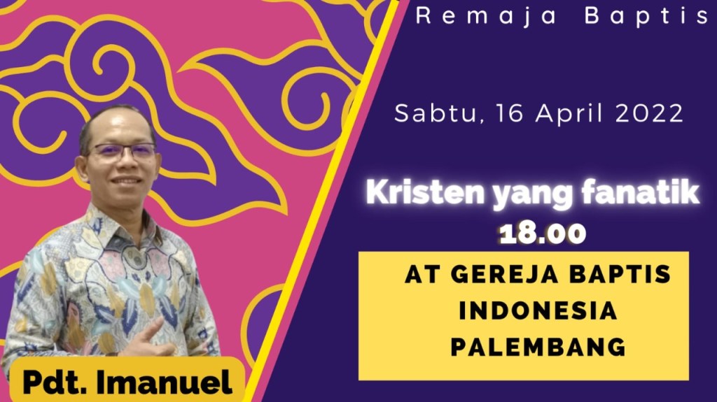 Diinformasikan kepada segenap Jemaat GBIP, kegiatan Ibadah Jumat Agung, tgl. 15 April 2022, dilaksanakan secara langsung & live Streaming Pk. 09.00 WIB. Dengan Prokes yang ketat, 3 orang boleh dalam 1 bangku. Firman Tuhan akan disampaikan oleh : Pdt. Imanuel Rajiono,S.Th,M.A.Ibadah Paskah minggu depan, Tanggal. 17 April 2022dimulai Pukul 09.00 WIB. Tema Gereja Bulan April 2022 : Murid Kristus Memikul Salibnya. Ibadah secara langsung & Live Streaming dengan protokol kesehatan yang ketat. Firman Tuhan akan disampaikan oleh Pdm. Artinus Telaumbanua, M.Th.Bagi seluruh Sidang Jemaat dapat mengikuti Layanan Ibadah Minggu Online melalui Akun Channel Youtube dan Facebook GBI Palembang secara LIVE STEREAMING, dapat memberikan komentar : “HADIR” pada video yang sedang Bp/Ibu/Sdr/i tonton.Bagi yang bertugas Perjamuan Tuhan pada Ibadah Jumat Agung, tgl. 15 April 2022 : Bp. Logimazo Jepedro Sinaga, Bp. Timotius Hendra Sutanto, Bp. Paulus Bomantoro,Bp, Gabriel Bayu harap memakai baju kemeja panjang berwarna putih memakai syal, celana dasar hitam dan bagi seluruh Jemaat agar dapat Mempersiapkan diri.Bagi Sidang jemaat yang mengikuti Ibadah secara Live Streaming, dapat mengambil Roti & Anggur di Kantor Gereja. Pada hari Selasa s.d Kamis, kantor buka dari jam 08.00 – 16.00 WIB.Seluruh Remaja GBIP mari hadir dalam Persekutuan PRBI pada hari Sabtu, 16 April 2022pukul 18.00 WIB di Gereja Baptis Indonesia Palembang, dengan Tema : “Kristen yang Fanatik“ Pembicara: Pdt. Imanuel Rajiono, S.Th.,M.A.Seluruh Kaum Pemuda GBIP mari hadir dalam persekutuan PKMB pada hari Sabtu, 16 April 2022 Pukul 18.30 WIB di GBIP, dengan Tema “Jesus The Only Savior” Kisah Para Rasul 4: 12. Pembicara : Sdr. Alfarius Robby Baptista, S.Pd.