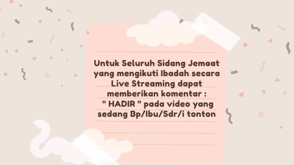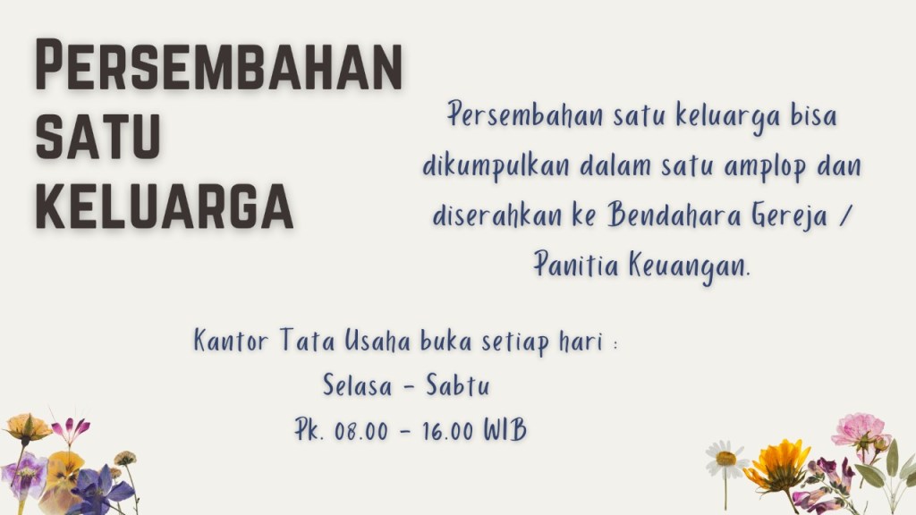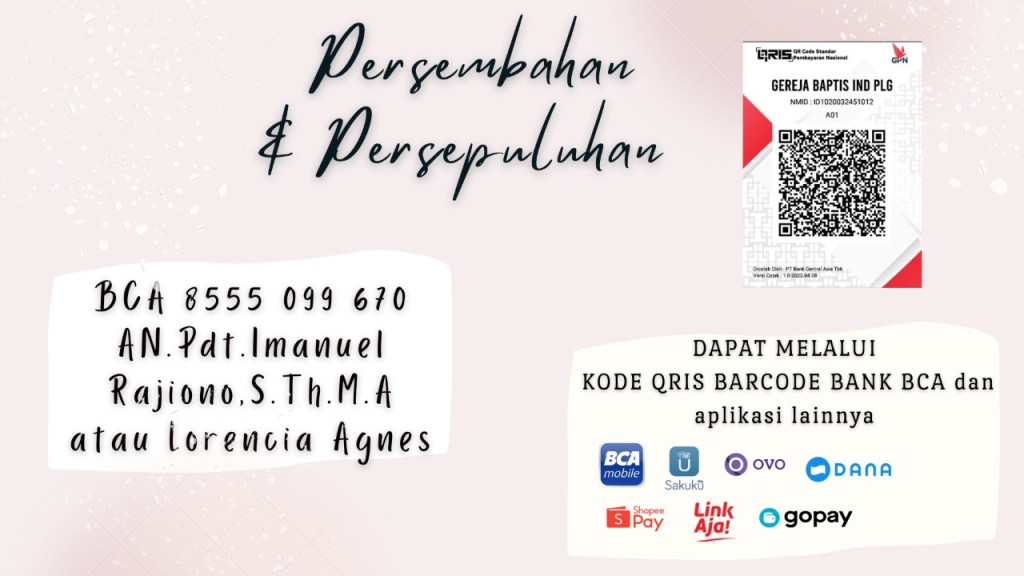 Bagi Jemaat yang mengikuti Ibadah Secara Live Streaming PERSEMBAHAN satu keluarga dapat dikumpulkan ke dalam satu amplop dan dapat diserahkan kepada Bendahara Gereja / Panitia Keuangan- Kantor Tata Usaha buka setiap hari : Selasa-Sabtu Jam 08.00 WIB – 16.00 WIB.PERSEMBAHAN dan PERSEPULUHAN dapat di transfer ke Rekening Gereja, Bank BCA No Rek. 855 509 9670A.N. Pdt. Imanuel Rajiono, S.Th., M.A atau Lorencia Agnes. Transaksi Pemberian Persembahan dan Persepuluhan Melalui Kode Barcode QRIS dari Bank BCA.
