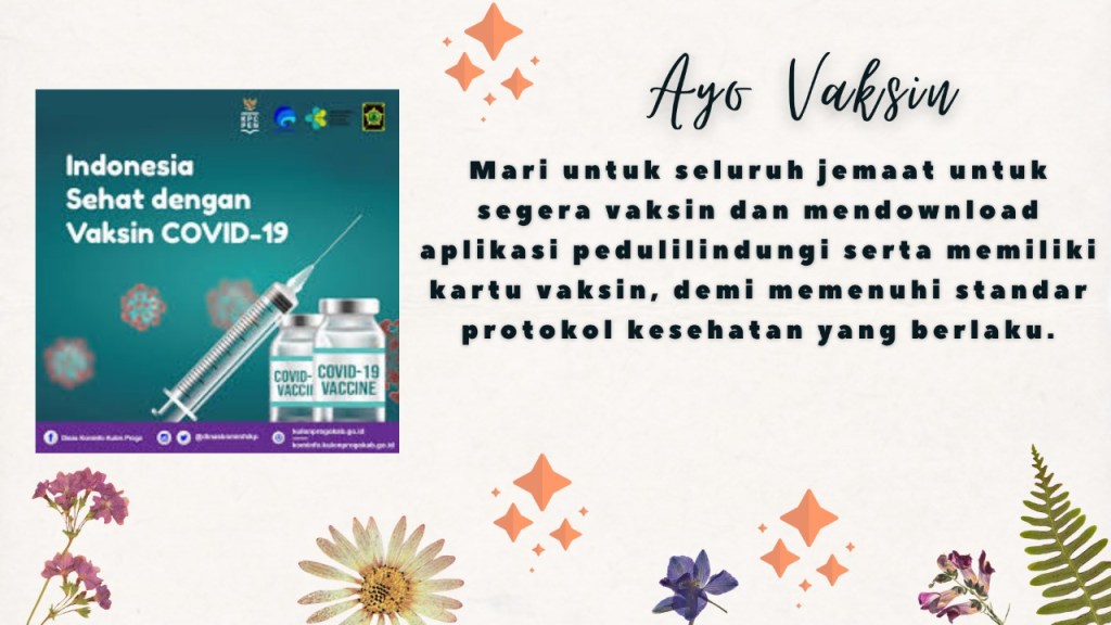 Mengingatkan bagi seluruh jemaat untuk segera vaksin dan mendownload aplikasi pedulilindungi serta memiliki kartu vaksin, guna memenuhi standar protokol kesehatan yang berlaku.