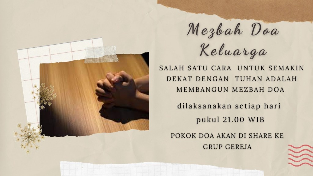 Membangun Mezbah Doa Keluarga : “DOA SERENTAK SELURUH JEMAAT”, Setiap Hari Pukul 21.00 WIB. Pokok – Pokok Doa dipersiapkan oleh Tim Doa dan akan di share di WA Group Gereja.