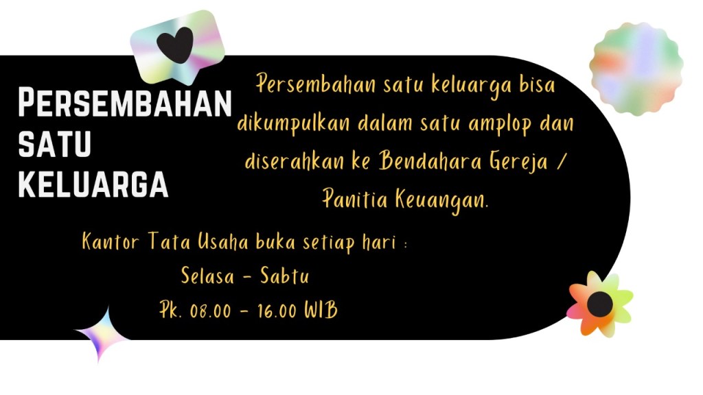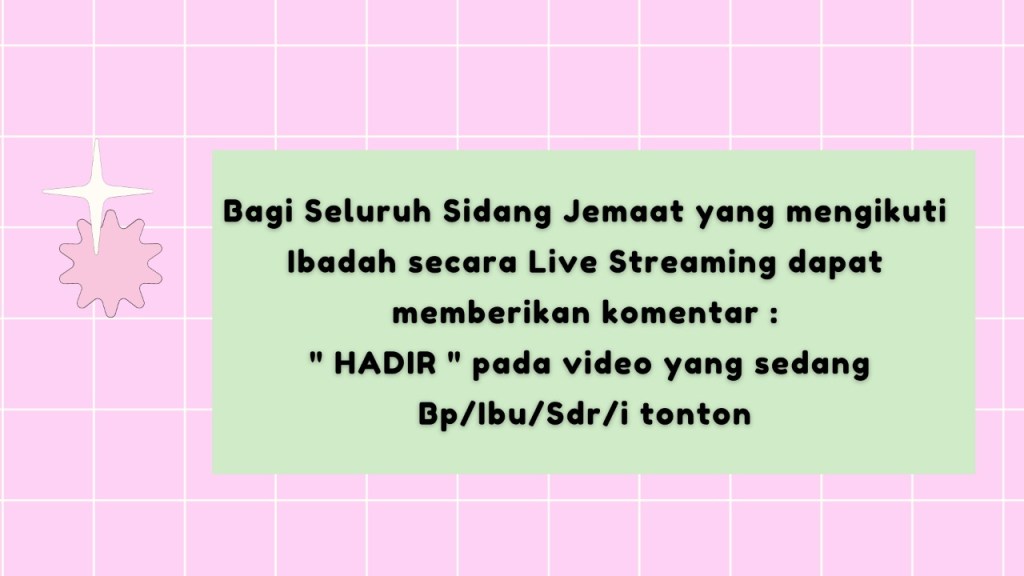 Mohon semua Peserta Acara Paskah Sekolah Minggu dari Kelas Indria s.d. Dewasa, dapat datang tepat waktu, menjaga kesehatan dan memakai masker sesuai Prokes dari pemerintah.