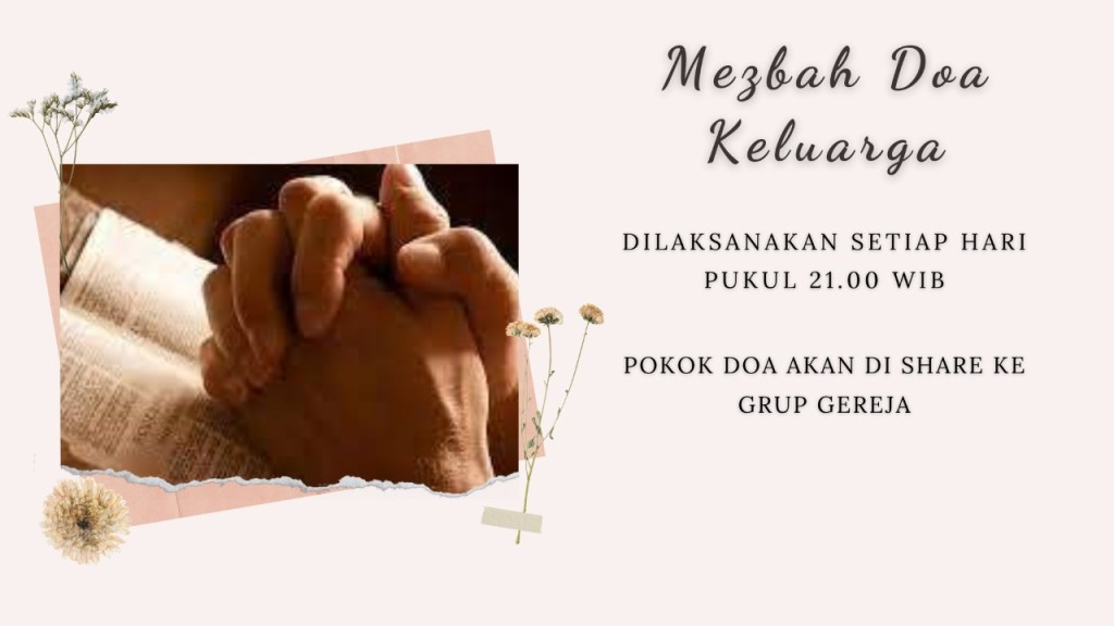 “DOA SERENTAK SELURUH JEMAAT”, Setiap Hari Pukul 21.00 WIB. Pokok – Pokok Doa dipersiapkan oleh Tim Doa dan akan di share di WA Group Gereja.
