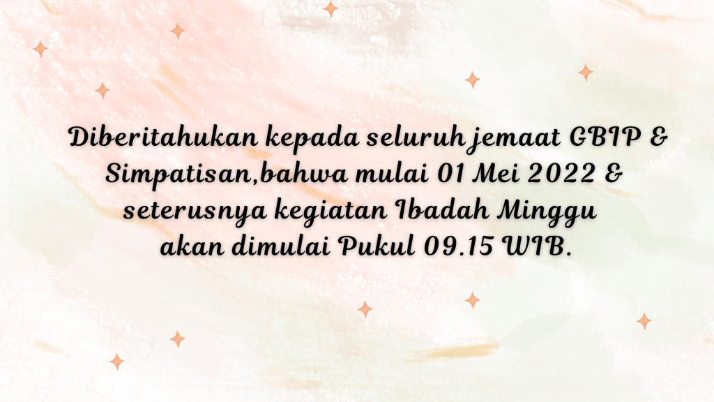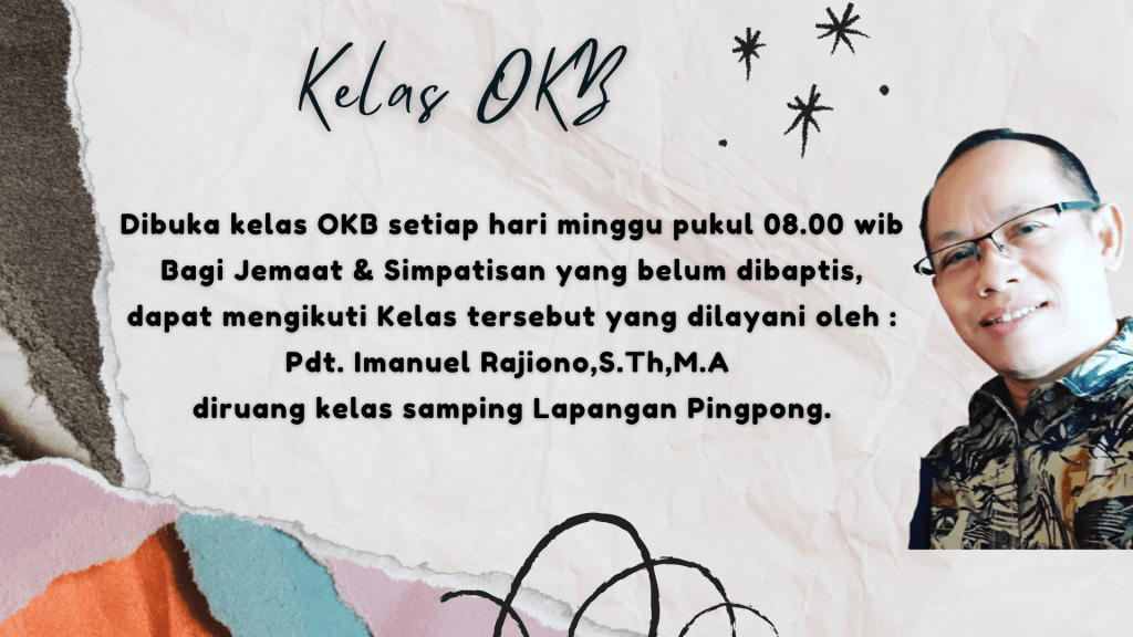 Bagi Seluruh Jemaat & Simpatisan yang belum dibaptis, dapat mengikuti Kelas Baptisan yang dilayani oleh Pdt. Imanuel Rajiono,S.Th,M.A. setiap hari Minggu, Pukul 08.00 WIB di ruang kelas samping Lapangan Pingpong.