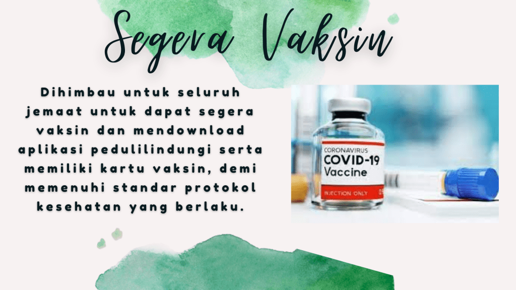 Mengingatkan bagi seluruh jemaat untuk segera vaksin dan mendownload aplikasi pedulilindungi serta memiliki kartu vaksin, guna memenuhi standar protokol kesehatan yang berlaku.