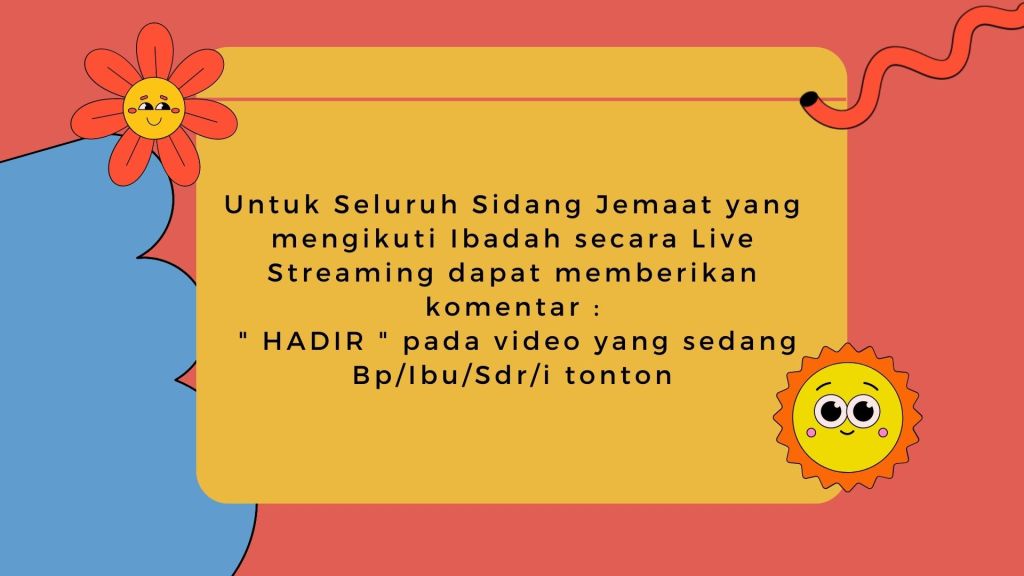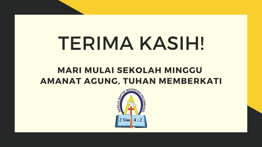 Bagi seluruh Sidang Jemaat dapat mengikuti Layanan Ibadah Minggu Online melalui Akun Channel Youtube dan Facebook GBI Palembang secara LIVE STEREAMING, dapat memberikan komentar : “HADIR” pada video yang sedang Bp/Ibu/Sdr/i tonton.