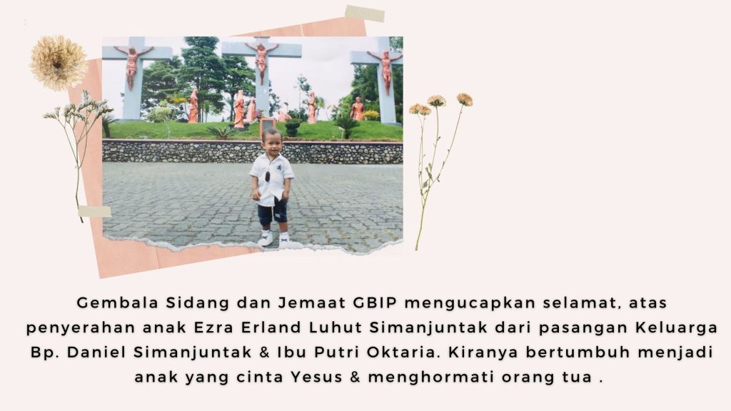 Gembala Sidang dan Jemaat GBIP mengucapkan selamat, atas penyerahan anak Ezra Erland Luhut Simanjuntak dari pasangan Keluarga Bp. Daniel Simanjuntak & Ibu Putri Oktaria. Kiranya bertumbuh menjadi anak yang cinta Yesus & menghormati orang tua .