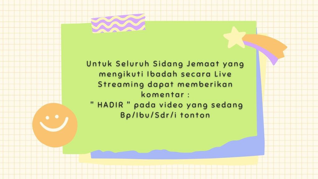Bagi seluruh Sidang Jemaat dapat mengikuti Layanan Ibadah Minggu Online melalui Akun Channel Youtube dan Facebook GBI Palembang secara LIVE STEREAMING, dapat memberikan komentar : “HADIR” pada video yang sedang Bp/Ibu/Sdr/i tonton.
