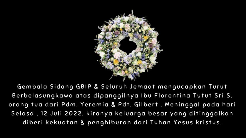 Gembala Sidang GBIP & Seluruh Jemaat mengucapkan Turut Berbelasungkawa atas dipanggilnya Ibu Florentina Tutut Sri S. Orang tua dari Pdm. Yeremia & Pdt. Gilbert . Meninggal pada hari Selasa , 12 Juli 2022, kiranya keluarga besar yang ditinggalkan diberi kekuatan & penghiburan dari Tuhan Yesus kristus.