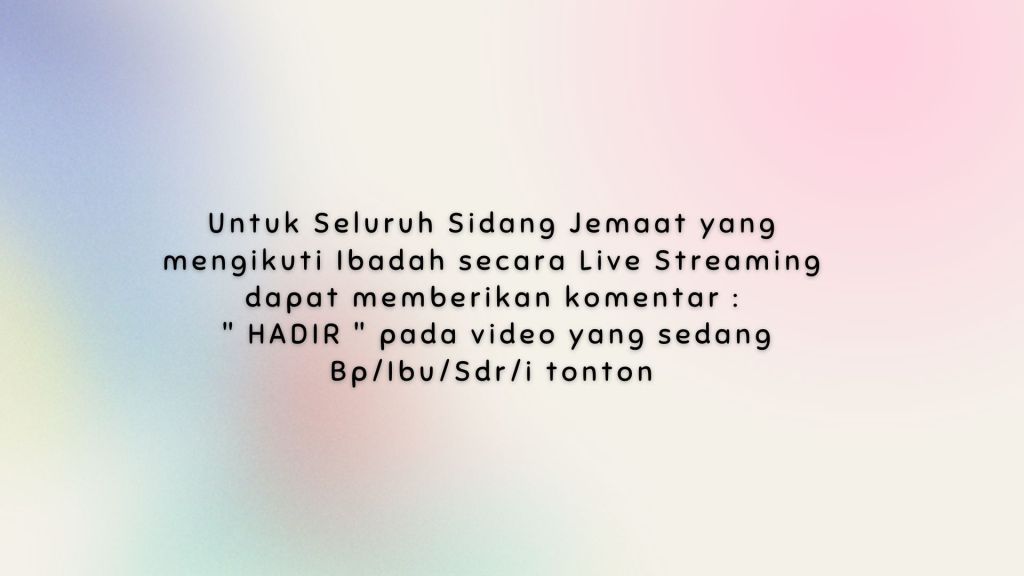 Bagi seluruh Sidang Jemaat dapat mengikuti Layanan Ibadah Minggu Online melalui Akun Channel Youtube dan Facebook GBI Palembang secara LIVE STEREAMING, dapat memberikan komentar : “HADIR” pada video yang sedang Bp/Ibu/Sdr/i tonton.