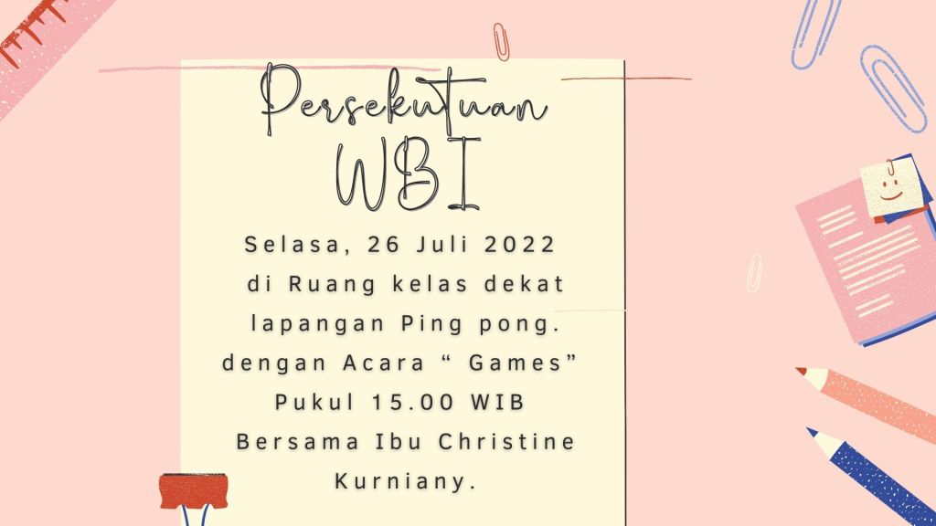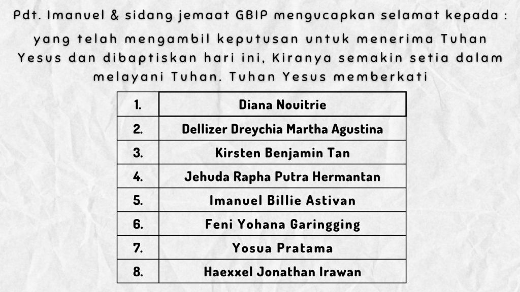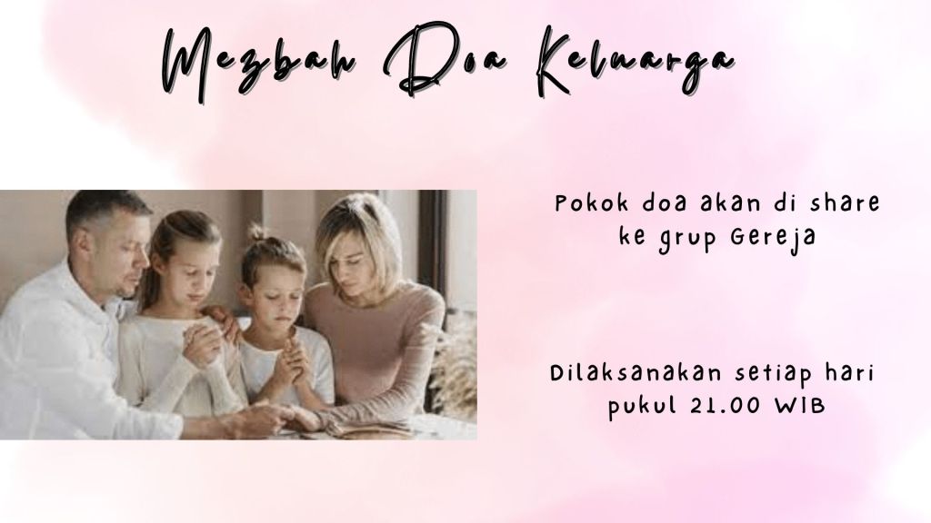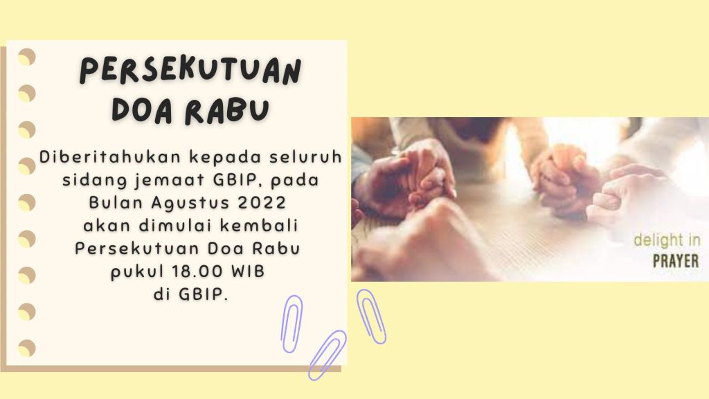 Diberitahukan kepada seluruh sidang jemaat GBIP, pada Bulan Agustus 2022 akan dimulai kembali Persekutuan Doa Rabu pukul 18.00 WIB di GBIP.