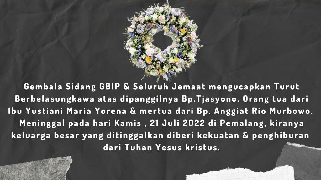Gembala Sidang GBIP & Seluruh Jemaat mengucapkan Turut Berbelasungkawa atas dipanggilnya Bp.Tjasyono. Orang tua dari Ibu Yustiani Maria Yorena & mertua dari Bp. Anggiat Rio Murbowo. Meninggal pada hari Kamis , 21 Juli 2022 di Pemalang, kiranya keluarga besar yang ditinggalkan diberi kekuatan & penghiburan dari Tuhan Yesus Kristus.
