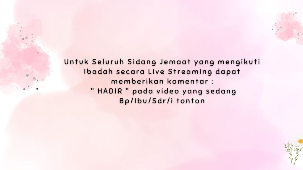 Bagi seluruh Sidang Jemaat dapat mengikuti Layanan Ibadah Minggu Online melalui Akun Channel Youtube dan Facebook GBI Palembang secara LIVE STEREAMING, dapat memberikan komentar : “HADIR” pada video yang sedang Bp/Ibu/Sdr/i tonton.