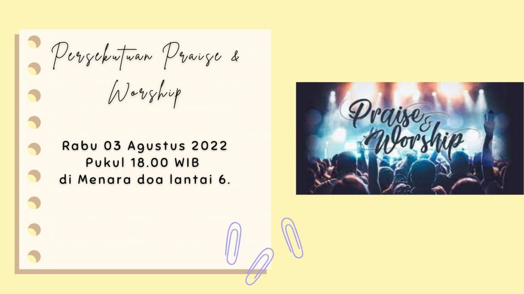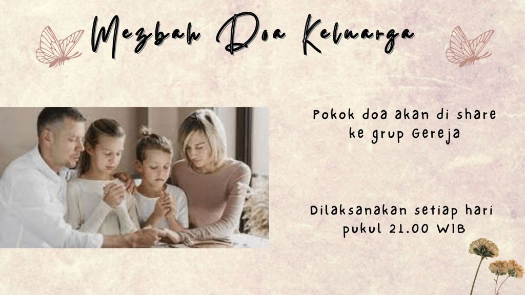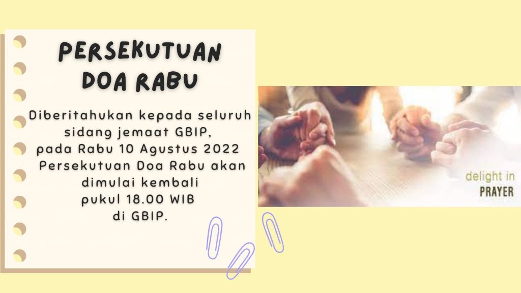 Kembali Mengingatkan kepada seluruh Sidang Jemaat bahwa Persekutuan Doa Rabu akan dimulai kembali pada Rabu, 10 Agustus 2022 Pukul 18.00 WIB di GBIP.