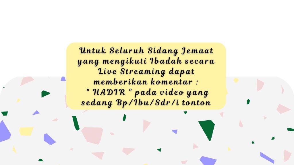 Bagi seluruh Sidang Jemaat dapat mengikuti Layanan Ibadah Minggu Online melalui Akun Channel Youtube dan Facebook GBI Palembang secara LIVE STEREAMING, dapat memberikan komentar : “HADIR” pada video yang sedang Bp/Ibu/Sdr/i tonton.