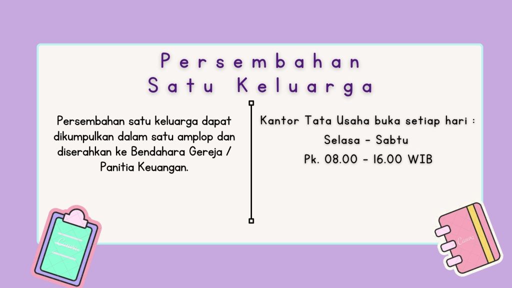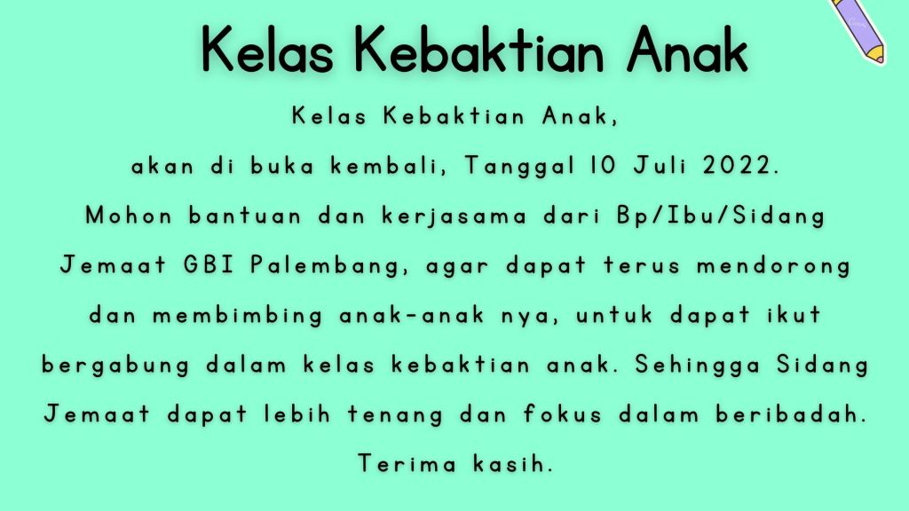 Mohon bantuan dan kerjasama dari Bp/Ibu/Sidang Jemaat GBI Palembang, agar dapat terus mendorong dan membimbing anak-anak nya, untuk dapat ikut bergabung dalam kelas kebaktian anak. Sehingga Sidang Jemaat dapat lebih tenang dan fokus dalam beribadah. Terima kasih.
