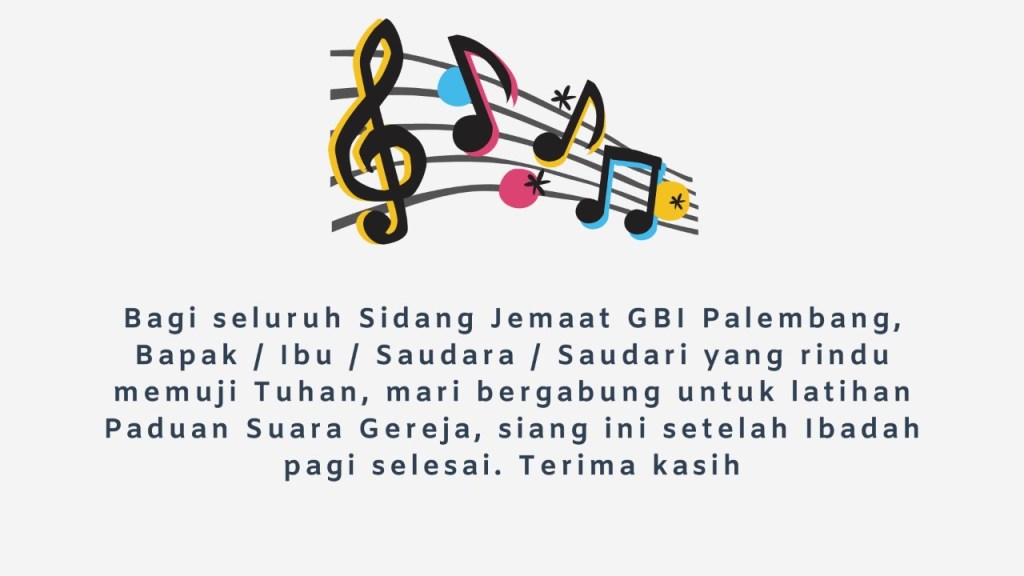 Bagi seluruh Sidang Jemaat GBI Palembang, Bapak / Ibu / Saudara / Saudari yang rindu memuji Tuhan, mari bergabung untuk latihan Paduan Suara Gereja, siang ini setelah Ibadah pagi selesai. Terima kasih