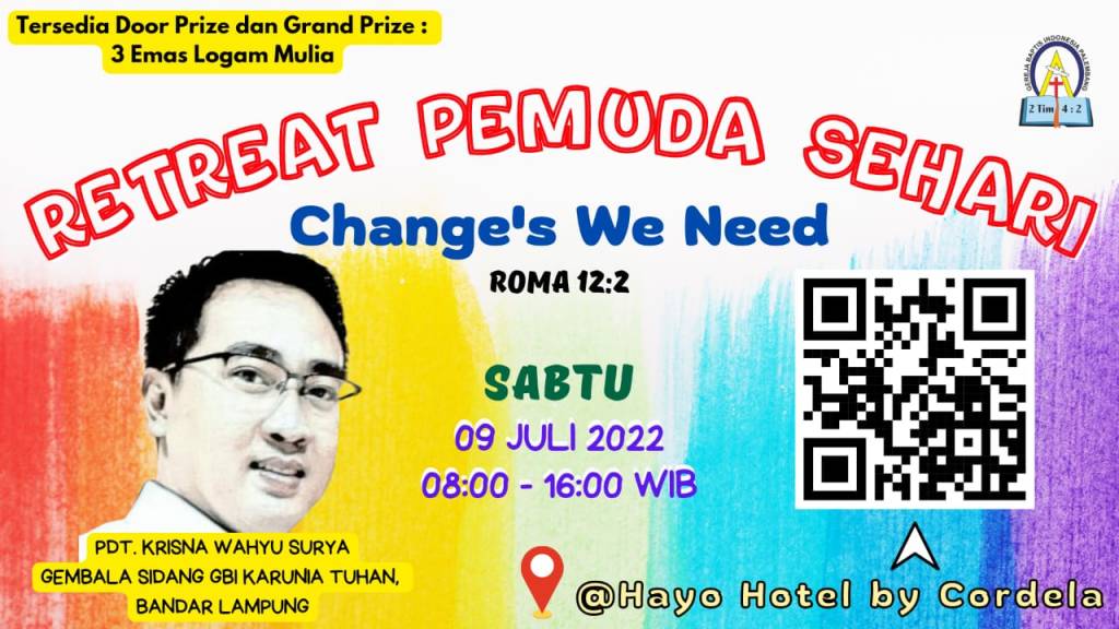 Mari seluruh kaum Pemuda diundang hadir dalam Retreat Pemuda Sehari “ Change’s We Need” Roma 12:2 pada hari Sabtu, 09 Juli 2022 di Hayo Hotel by Cordela Pukul 08.00 – 16.00 WIB Pembicara Pdt. Krisna Wahyu Surya Gembala Sidang GBI Kerunia Tuhan, Bandar Lampung.