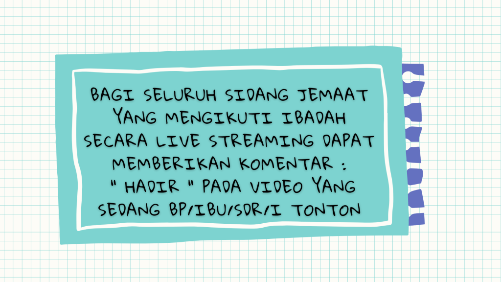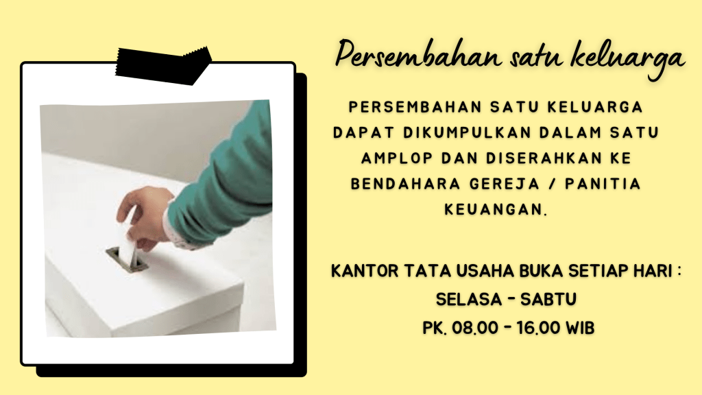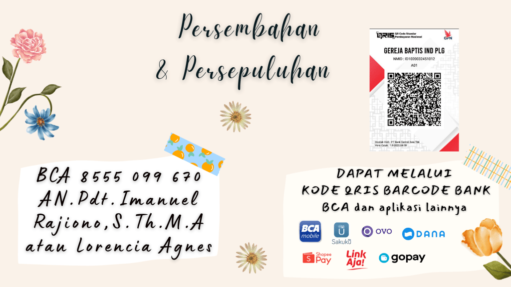 Bagi Jemaat yang mengikuti Ibadah Secara Live Streaming PERSEMBAHAN satu keluarga dapat dikumpulkan ke dalam satu amplop dan dapat diserahkan kepada Bendahara Gereja / Panitia Keuangan- Kantor Tata Usaha buka setiap hari : Selasa-Sabtu Jam 08.00 WIB – 16.00 WIB.PERSEMBAHAN dan PERSEPULUHAN dapat di transfer ke Rekening Gereja, Bank BCA No Rek. 855 509 9670A.N. Pdt. Imanuel Rajiono, S.Th., M.A atau Lorencia Agnes. Transaksi Pemberian Persembahan dan Persepuluhan Melalui Kode Barcode QRIS dari Bank BCA.