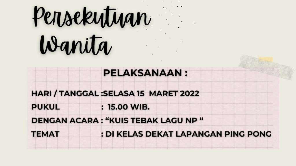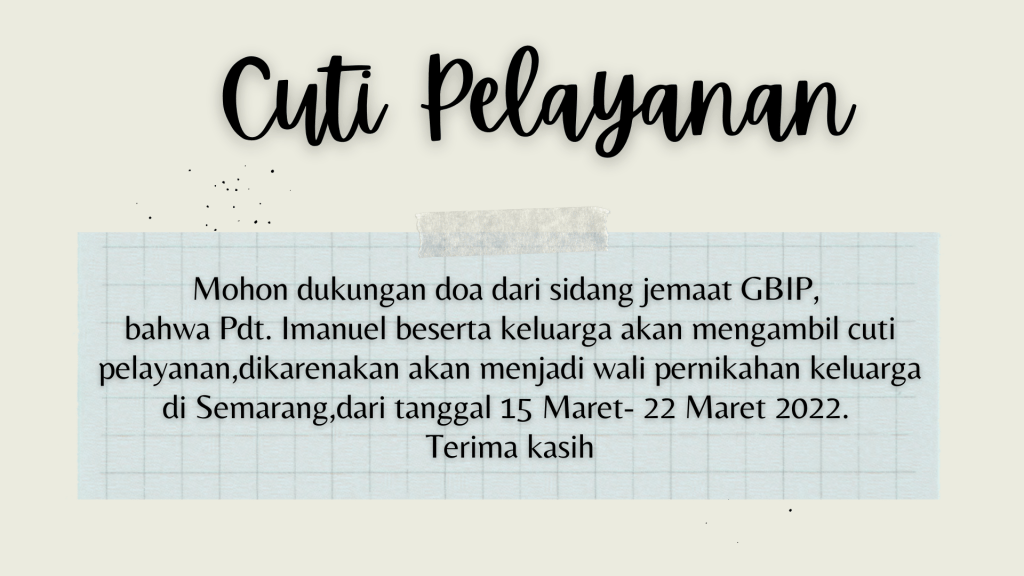 Diinformasikan kepada segenap Jemaat GBIP, kegiatan Ibadah minggu depan, tgl. 20 Maret 2022 dilaksanakan secara LangsungOnsite dan Live Streaming Pk. 09.00 WIB, dengan protokol kesehatan yang ketat. Firman Tuhan akan disampaikan oleh Pdm. Artinus Telaumbanua, M.Th.Bagi seluruh Sidang Jemaat dapat mengikuti Layanan Ibadah Minggu Online melalui Akun Channel Youtube dan Facebook GBI Palembang secara LIVE STEREAMING, dapat memberikan komentar : “HADIR” pada video yang sedang Bp/Ibu/Sdr/i tonton.Mohon dukungan doa dari sidang jemaat GBIP, bahwa Pdt. Imanuel beserta keluarga akan mengambil cuti pelayanan, dikarenakan akan menjadi wali pernikahan keluarga di Semarang, dari tanggal 15 Maret- 22 Maret 2022. Terima kasih.Seluruh Kaum wanita diundang hadir dalam Persekutuan WBI pada hari, Selasa 15 Maret 2022 pukul 15.00 WIB. Dengan acara “Kuis Tebak Lagu NP “ di kelas dekat lapangan ping pong.Seluruh Kaum Remaja diundang hadir dalam Persekutuan PRBI pada hari Sabtu,19 Maret 2022 Pukul 18.00 WIBVia Whatsapp dengan Acara ”God Calling” With Sdri. Caren & Maria. Mari Kaum Pemuda hadir dalam Persekutuan PKMB dengan acara “K P K” di GBIP, pada hari Sabtu, 19 Maret 2022 pukul 18.00 WIB.Bantuan Beasiswa dari Sidang Jemaat/Simpatisan dan Donatur Tahun 2022 (untuk bulan Jan, Feb, Mar), akan diberikan kepada Siswa/Siswi pada hari, Minggu, 20 Maret 2022 Pukul 10.30 WIB setelah selesai ibadah pagi di ruang kelas samping Gereja.*Penerima Beasiswa akan dihubungi personal oleh Panitia Sosial Terima kasih. Tuhan memberkati.Mengingatkan bagi seluruh jemaat untuk segera vaksin dan mendownload aplikasi pedulilindungi serta memiliki kartu vaksin, guna memenuhi standar protokol kesehatan yang berlaku.