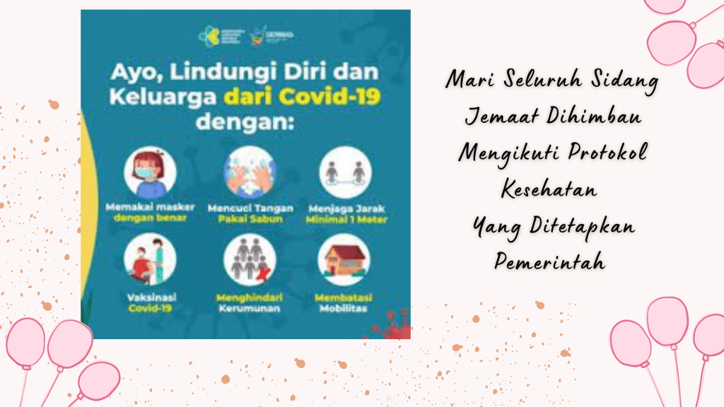 Himbauan kepada seluruh sidang jemaat GBIP, dihimbau untuk mengikuti Protokol Kesehatan yang ditetapkan oleh Pemerintah, dengan 5M+VDJ : Mencuci tangan, Memakai masker (baiknya rangkap 2 ), Menjaga jarak, Menghindari kerumunan, Mengurangi mobilitas, Ventilasi, Durasi dan Jarak .