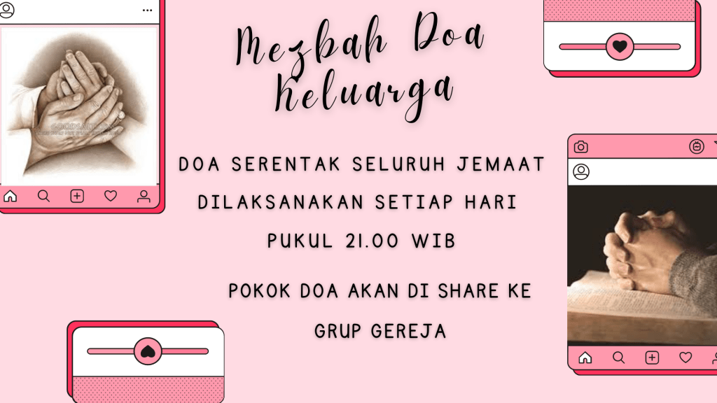 Membangun Mezbah Doa Keluarga : “DOA SERENTAK SELURUH JEMAAT”, Setiap Hari Pukul 21.00 WIB. Pokok – Pokok Doa dipersiapkan oleh Tim Doa dan akan di share di WA Group Gereja.