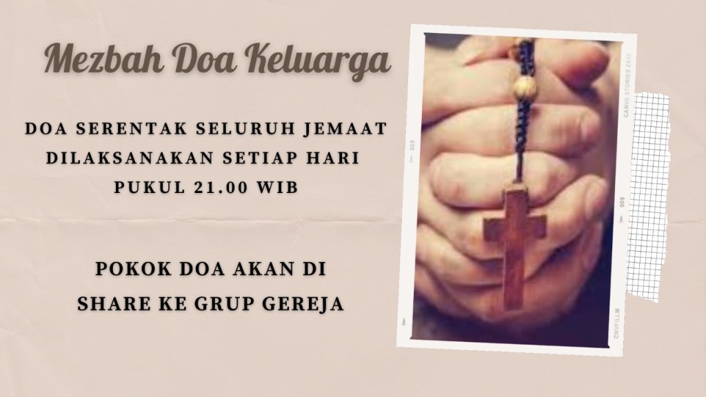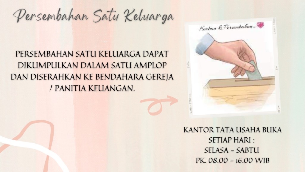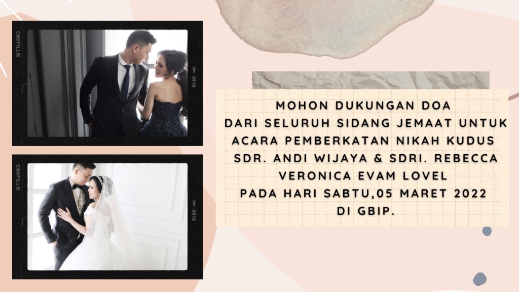 Mohon dukungan doa dari seluruh sidang Jemaat untuk acara Pemberkatan Nikah Kudus, Sdr. Andi Wijaya & Sdri. Rebecca Veronica Evam Lovely, pada Sabtu,05 Maret 2022 di GBIP pukul 10.00 WIB.