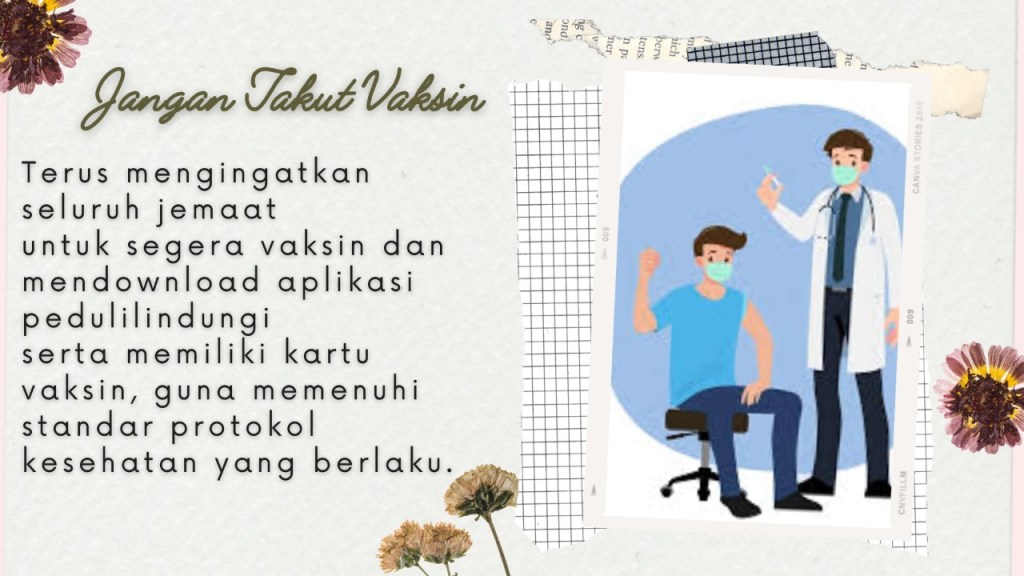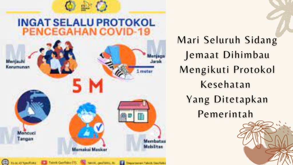 Mengingatkan bagi seluruh Sidang Jemaat untuk dapat segera Vaksin dan download aplikasi Peduli lindungi serta memiliki sertifikat vaksin guna memenuhi standar prokes yang berlaku.