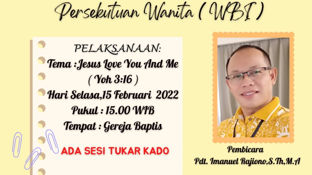 Seluruh kaum Wanita diundang hadir dalam Persekutuan WBI pada hari Selasa,15 Februari 2022 di GBIP. Dengan Tema “ Jesus Love you And me”( Yohanes 3:16 ). WL : Ibu Yustiani, Pembicara : Pdt. Imanuel Rajiono,S.Th,M.A, akan ada sesi tukar kado.