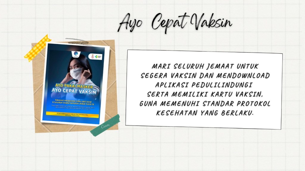 Mengingatkan bagi seluruh Sidang Jemaat untuk dapat segera Vaksin dan download aplikasi Pedulilindungi serta memiliki sertifikat vaksin guna memenuhi standar prokes yang berlaku.