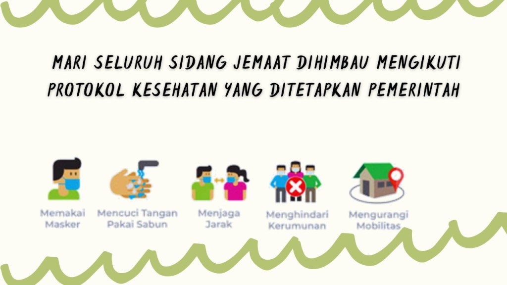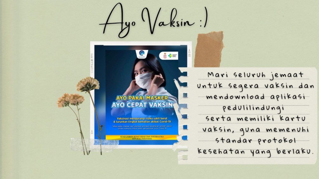 Mengingatkan bagi seluruh Sidang Jemaat untuk dapat segera Vaksin dan download aplikasi Pedulilindungi serta memiliki sertifikat vaksin guna memenuhi standar prokes yang berlaku.