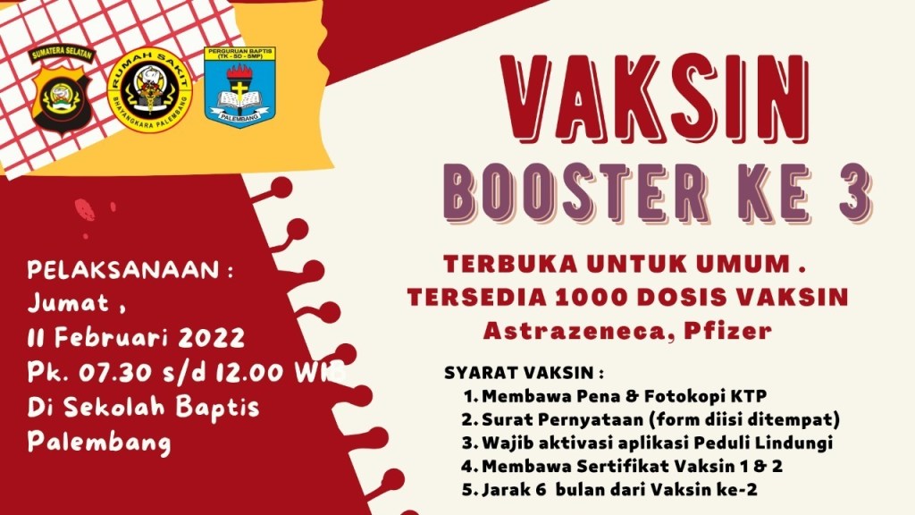 Diberitahukan kepada seluruh Sidang Jemaat GBI Palembang bawah Gereja dan Sekolah Baptis Palembang bekerjasama dengan RS Bhayangkara mengadakan Vaksin Bosster ke-3 pada hari Jum’at, 11 Februari 2022 jam 07.30 WIB s.d. 12.00 WIB di Sekolah Baptis gedung lama, lantai 1. Syarat Vaksin :
