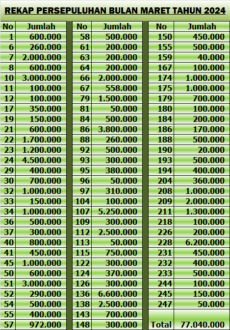 | IBADAH MINGGU 7 APRIL 2024 | 120 | PERSEMBAHAN | 2.001.000 |