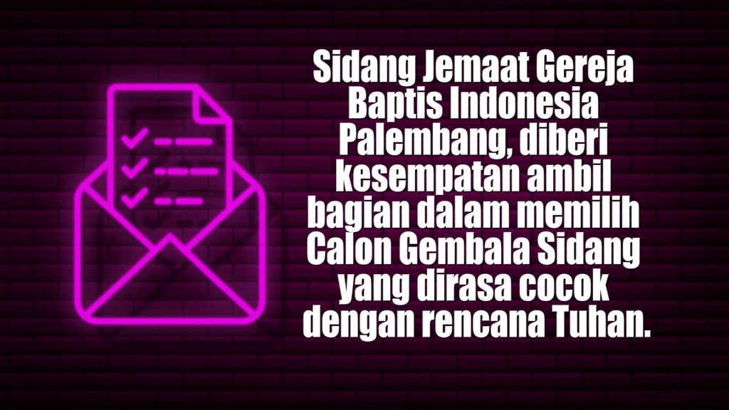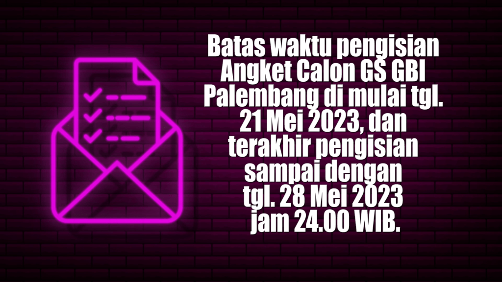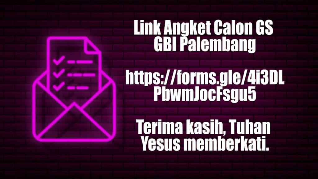 Informasi dan Cara Pengisian Angket Calon Gembala Sidang GBI Palembang, akan di jelaskan setelah Ibadah Pagi ini. Link secara resmi dibuka, dan dibagikan saat pengisian Angket Calon Gembala Sidang bersama-sama. Terima Kasih.