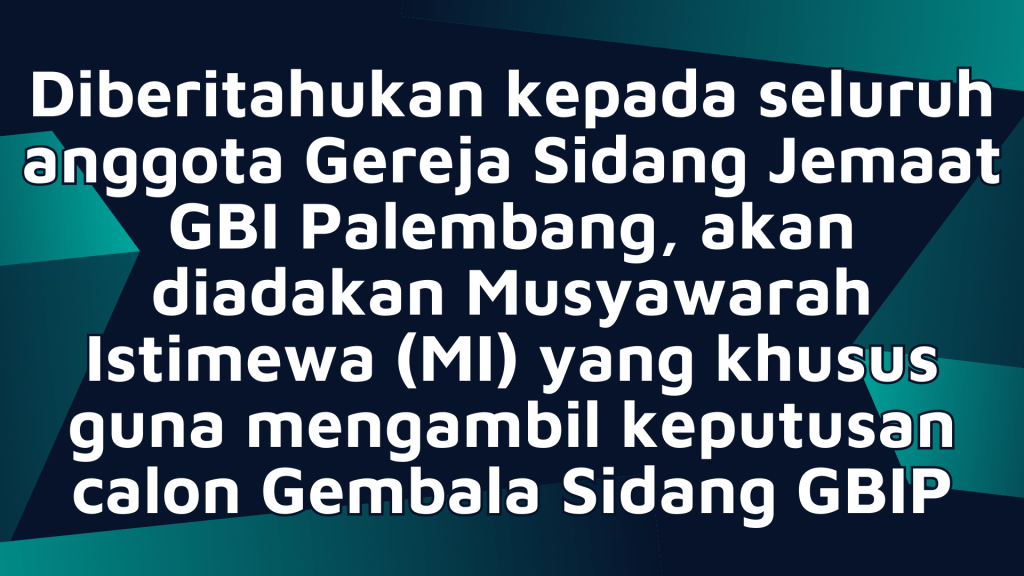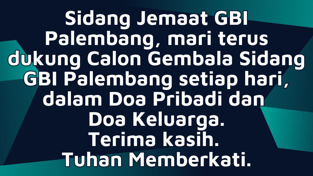 Mari Sidang Jemaat GBI Palembang yang di kasihi Tuhan, terus dukung dalam doa pribadi dan dalam doa keluarga, agar Panitia Pencalonan Gembala Sidang serta Sidang Jemaat GBIP sama-sama mencari maksud rencana dan kehendak Tuhan yang terbaik untuk Calon Gembala Sidang Baru, guna melanjutkan pekerjaan pelayanan Tuhan di GBIP.