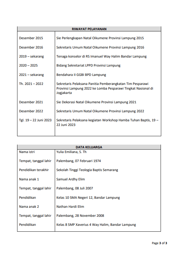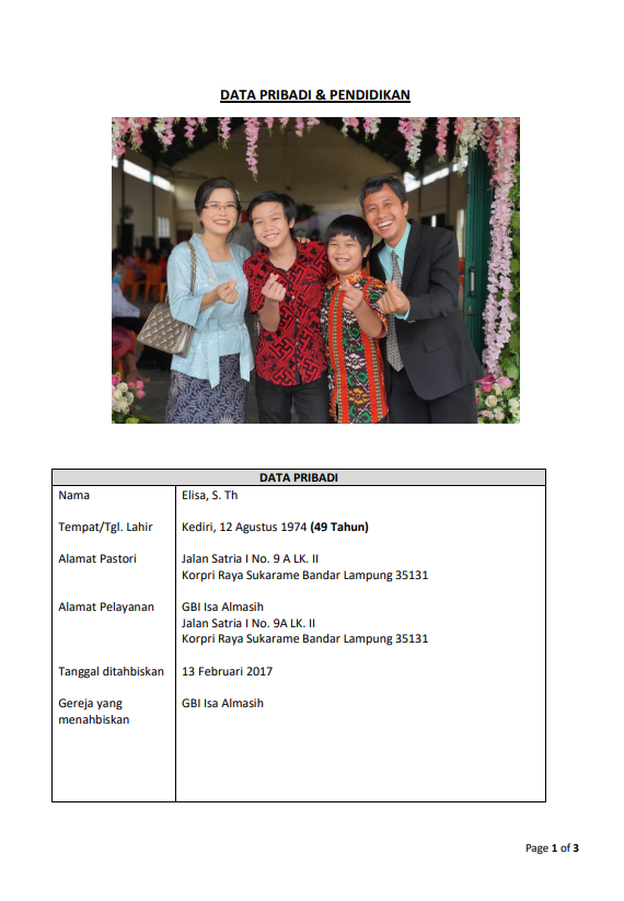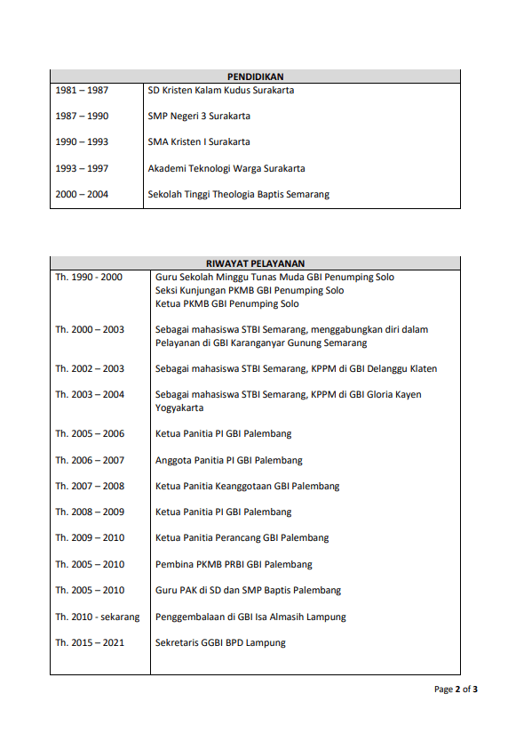 DATA PRIBADI & RIWAYAT PELAYANAN CALON GEMBALA SIDANG GBI PALEMBANG.