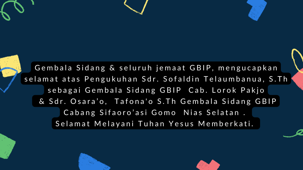 Gembala Sidang & seluruh jemaat GBIP, mengucapkan selamat atas Pengukuhan Sdr. Sofaldin Telaumbanua, S.Th sebagai Gembala Sidang GBIP Cab. Lorok Pakjo & Sdr. Osara’o, Tafona’o S.Th Gembala Sidang GBIP Cabang Sifaoro’asi Gomo Nias Selatan. Selamat Melayani Tuhan Yesus Memberkati.