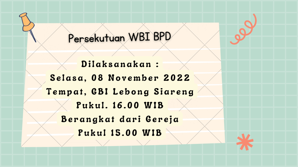 Seluruh Kaum wanita diundang hadir dalam Persekutuan WBI BPD Selasa, 08 November 2022 di GBI Lebong Siareng pukul 16.00 WIB, berangkat dari gereja Pukul 15.00 WIB.