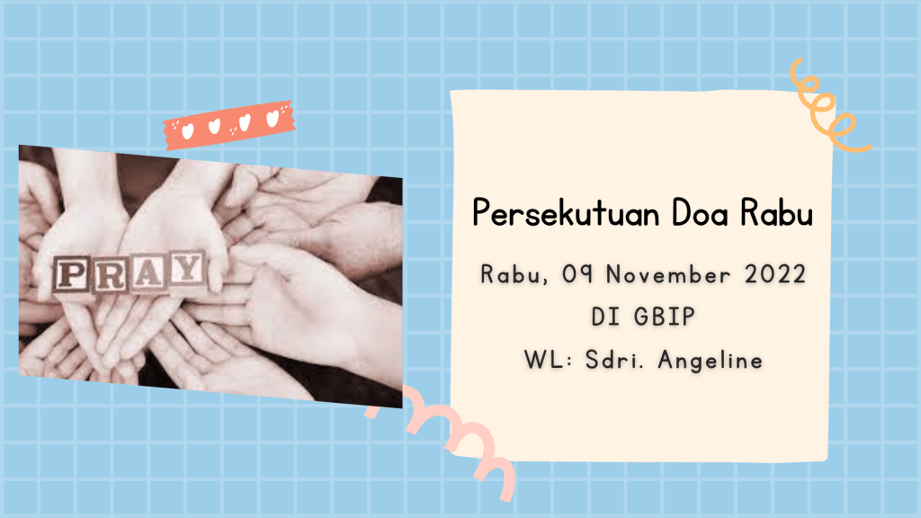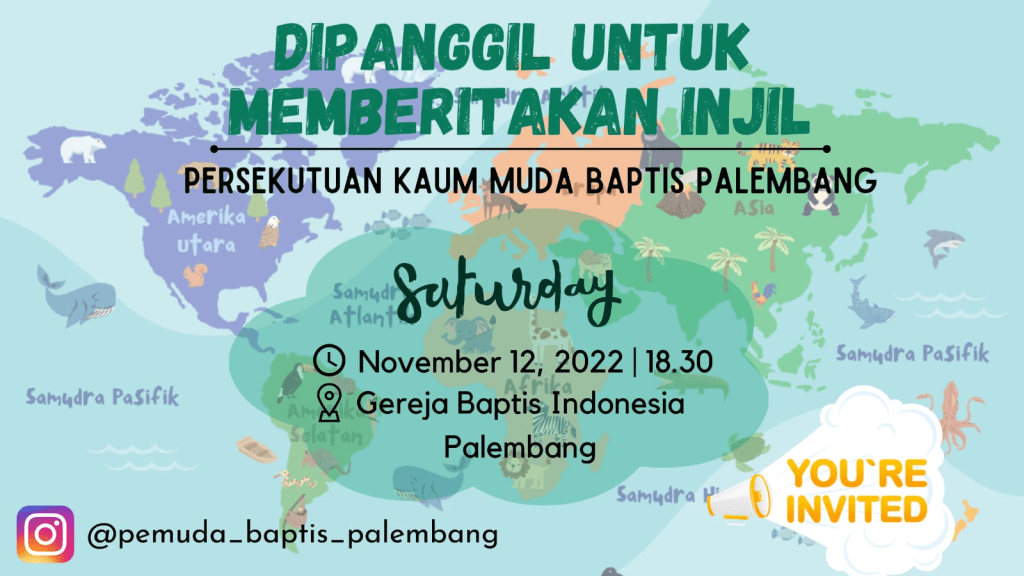 Seluruh Kaum Pemuda diundang hadir dalam Persekutuan PKMB pada Sabtu 12 November 2022 pukul 18.30 WIB di GBIP, dengan acara “Dipanggil Untuk Memberitakan Injil”