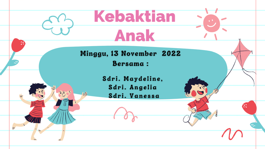Mari anak-anak ikut bergabung dalam kebaktian anak. Minggu 13 November 2022 bersama Sdri. Maydeline, Sdri. Angelia & Sdri. Vanessa