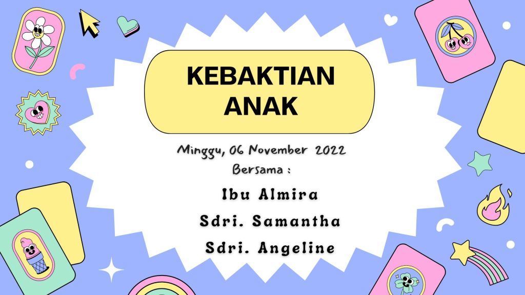 Mari anak-anak ikut bergabung dalam kebaktian anak. Minggu 06 November 2022 bersama Ibu Almira, Sdri. Samantha, dan Sdri. Angeline