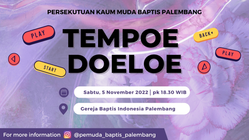 Seluruh Kaum Pemuda diundang hadir dalam Persekutuan PKMB pada Sabtu 05 November 2022 pukul 18.30 WIB di GBIP, dengan acara “Tempoe Doeloe”