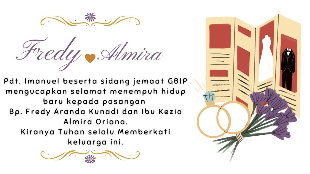 Pdt. Imanuel beserta sidang jemaat GBIP mengucapkan selamat menempuh hidup baru kepada pasangan Bp. Fredy Aranda Kunadi dan Ibu Kezia Almira Oriana. Kiranya Tuhan selalu Memberkati keluarga ini.