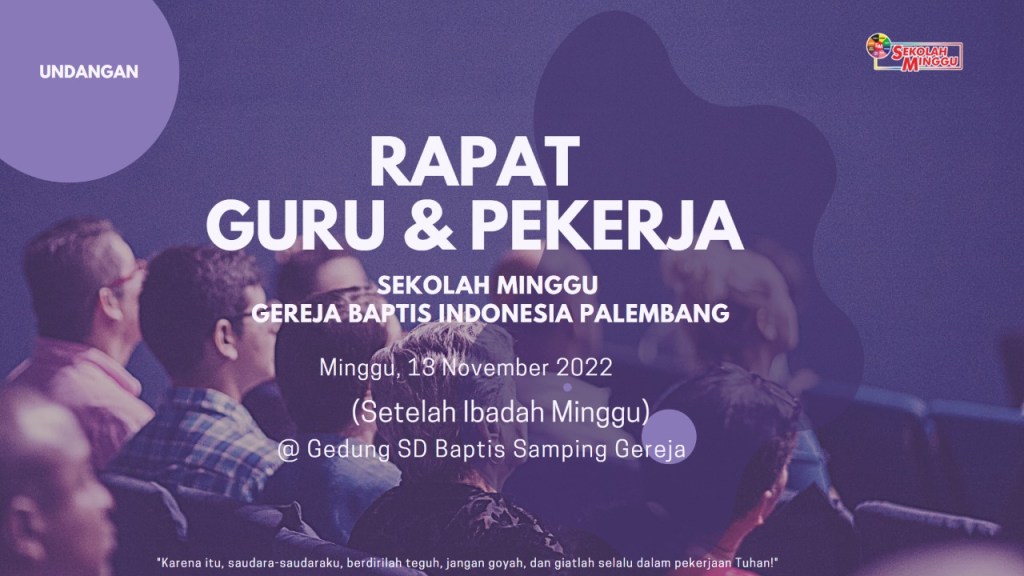 Seluruh Guru & Pekerja SM diundang hadir dalam Rapat siang ini setelah ibadah selesai. Di ruang kelas samping Gereja.