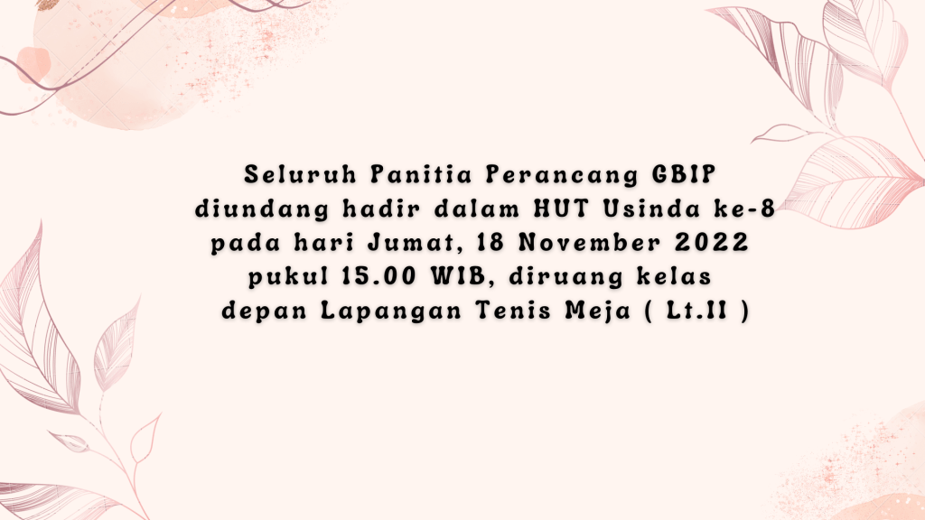 Seluruh Panitia Perancang GBIP diundang hadir dalam HUT Usinda ke-8 pada hari Jumat, 18 November 2022 pukul 15.00 WIB, diruang kelas depan Lapangan Tenis Meja ( Lt.II )
