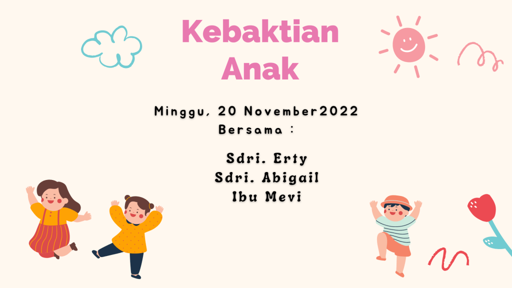Mari anak-anak ikut bergabung dalam kebaktian anak. Minggu, 20 November 2022 bersama Sdri. Erty, Sdri. Abigail & Ibu Mevi.